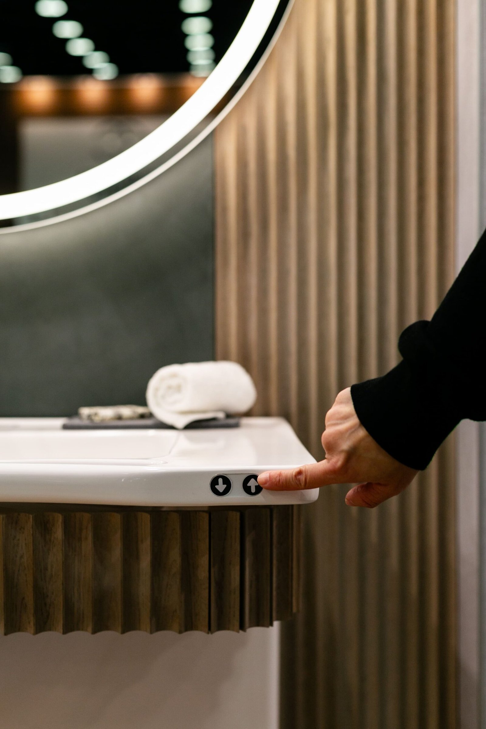 One of the biggest showstoppers was the vanity. With the push of a button, the sink could move up or down about eight inches to suit different heights. Built-in handholds on each side made it easy to steady yourself, and the curved front let wheelchair users roll in close and comfortably. Visitors were so impressed they pulled out their phones to record it in action. The technology was designed to make the space work for a wide range of bodies and abilities.